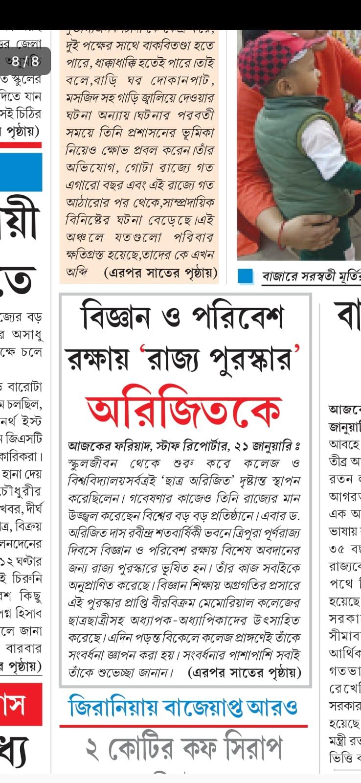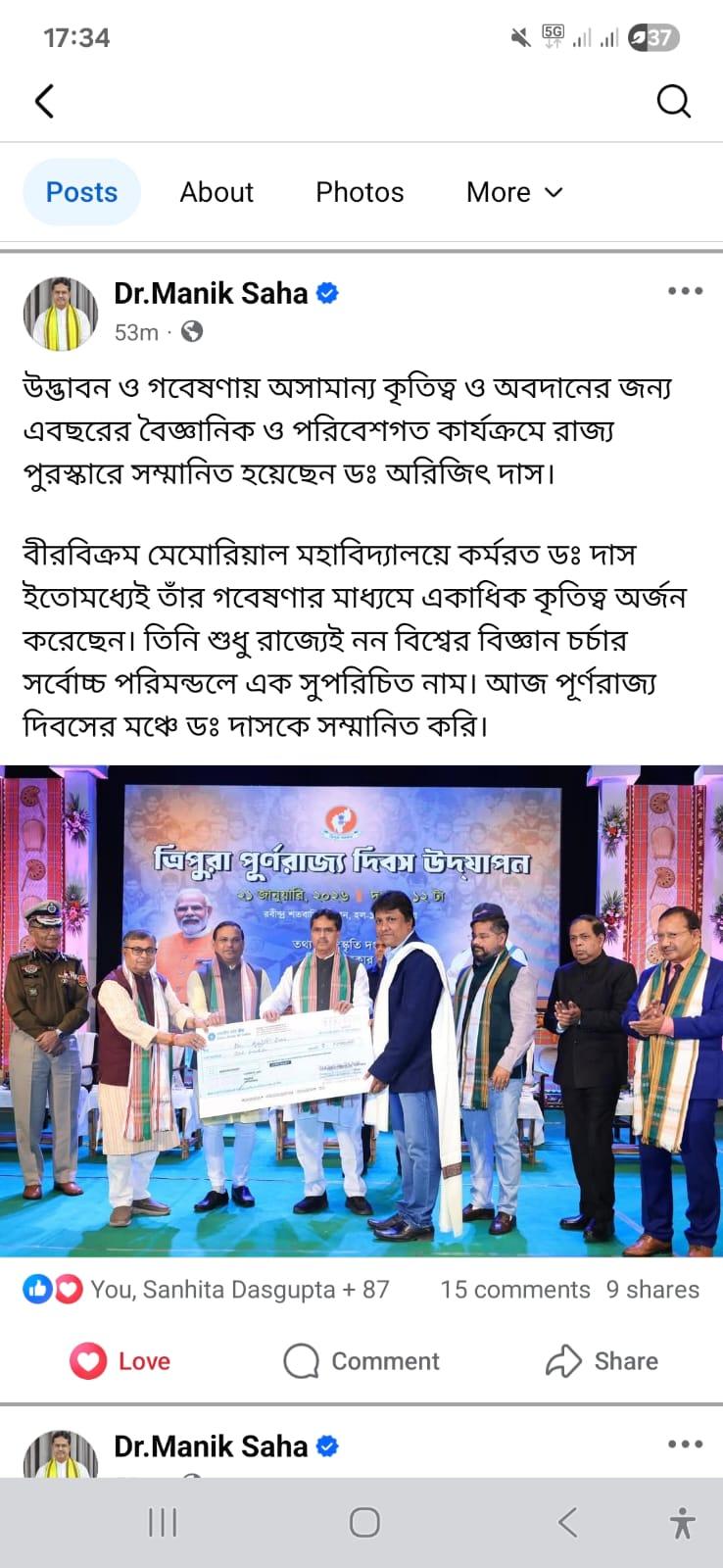 Celebration on Receiving ‘State Civil Award 2026’ of Dr. Arijit Das in the field of Scientific and Environmental Activities with some eminent personalities of Tripura dated Jan 09, 2026